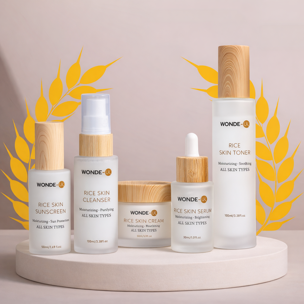 Transform your daily skincare routine with the Wonde-Uk Rice Skincare Complete 5-Step Set, a full facial care solution powered by premium Gyeonggi rice extract from Korea.